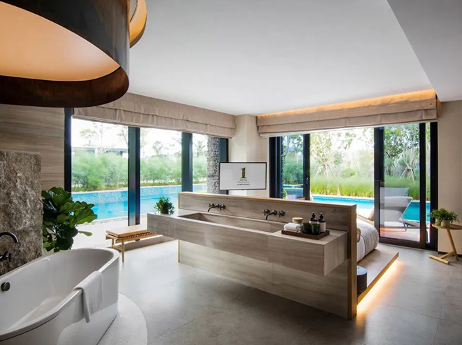 星級酒店 該項目位于景色宜人的著名旅游城市“三亞”。該項目重點工程三亞海棠灣陽光壹酒店1 Hotels以自然及可持續發展為本,擁有294間面積達62至1,300平方米的客房、套房及復式別墅。回歸自然、簡約原始的設計風格,巧妙搭配多種未經拋光的當地天然石材和木材,打造渾厚多元的紋理及細膩和諧的配色,輔以原木打造的凳子、書桌、藤編地毯、融進自然的定制藝術品以及有機棉裝飾等,純粹而時尚。