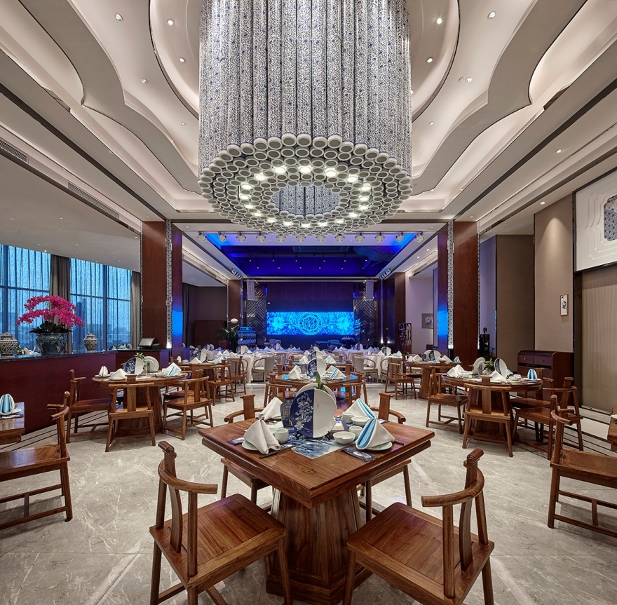 寬敞而對稱的宴客大廳,一盞3米直徑的巨型吊燈是全場的視覺焦點更是餐廳的點睛之筆,由100個薄胎青花瓷燈拼接而成,堪稱世界最大的單體陶瓷吊燈。