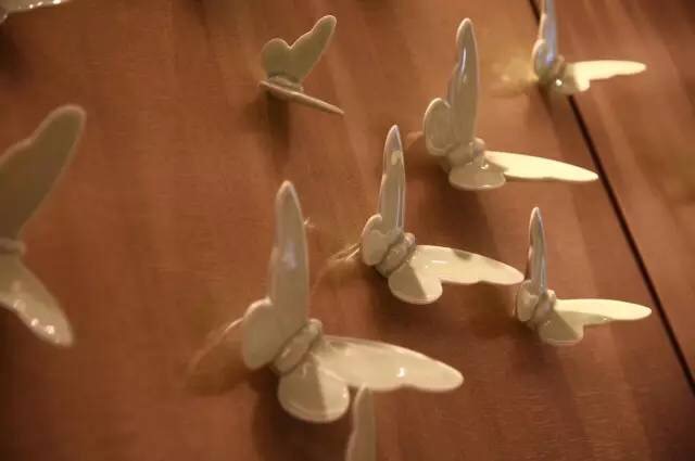宴客大廳前側(cè)弧形墻上,由平面設(shè)計大師楊超教授先生設(shè)計了199只翩翩飛舞的粉彩蝴蝶,寓意著貴賓們一生一世情愛久久。