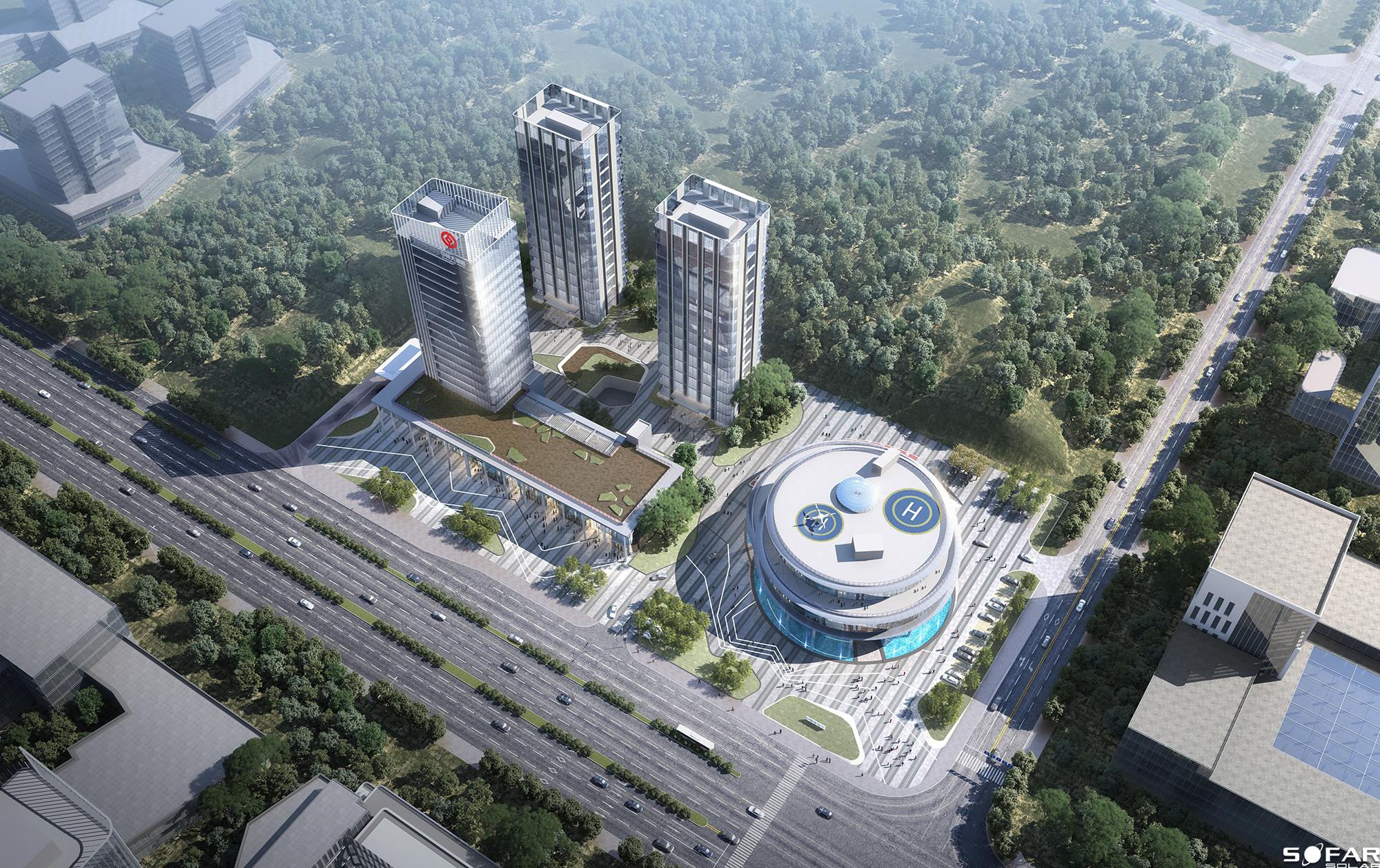 淮州新城國際會展中心采用圓形作為基本形體,通過透明玻璃幕墻從底部托起,營造出建筑整體懸浮半空的姿態,形似“UFO”飛行器。主要分為展覽中心、會議中心、航空博物館和設備用房及庫房等輔助功能區三部分功能分區。一層為展廳,服務于未來航空產業產品的展覽,二三層為會議功能區,服務于大型航空產業會議的召開,四層為航天博物館。未來,淮州新城國際會展中心將成為淮州新城通用航空產業對外展示的窗口。