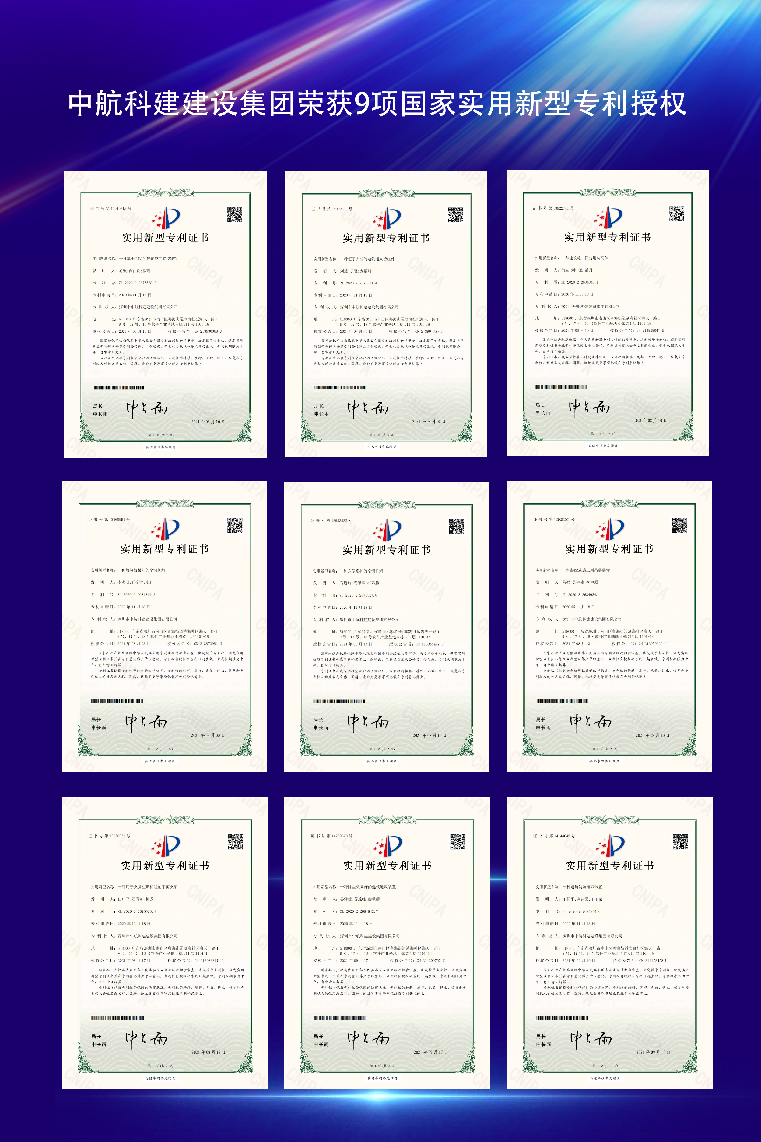 ? ? ? ?一直以來,中航科建建設集團注重把技術質量和科技創新有機結合,加大科研經費投入,注重知識產權保護,克服研發過程中的困難,解決了一個又一個施工難題,成功研發出一系列的新型專利,助力建筑裝飾行業科學、健康發展。