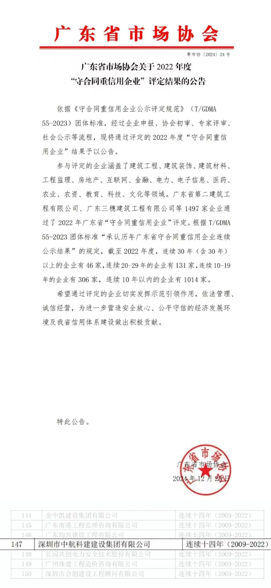 ? ? 近日,廣東省市場(chǎng)協(xié)會(huì)發(fā)布2022年度“守合同重信用企業(yè)”評(píng)選結(jié)果。中航科建集團(tuán)連續(xù)十四年榮獲廣東省“守合同重信用企業(yè)”稱號(hào)。